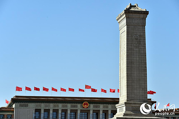 3月1日,2015年全國兩會即將召開。當日,北京風和日麗,藍天空氣質量好,北京天安門廣場、人民大會堂,紅旗迎風招展,喜迎全國兩會開幕。
