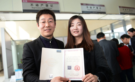 3月1日,《不動(dòng)產(chǎn)登記暫行條例》開(kāi)始施行。國(guó)土資源部部長(zhǎng)姜大明在江蘇徐州市為申請(qǐng)領(lǐng)證的市民頒發(fā)了全國(guó)第一本不動(dòng)產(chǎn)權(quán)證書(shū)。圖為當(dāng)日在江蘇徐州市不動(dòng)產(chǎn)登記交易服務(wù)中心,市民邢衛(wèi)鋒、趙媛媛夫婦在展示編號(hào)為001的不動(dòng)產(chǎn)權(quán)證書(shū)。