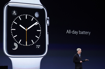 圖為當地時間9日,蘋果公司首席執行官蒂姆·庫克在舊金山介紹AppleWatch。