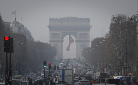 法國巴黎凱旋門被霧霾籠罩(3月20日攝)。 法國巴黎警察局3月23日在首都巴黎及周邊3個省份臨時采取車輛單雙號限行等緊急措施,應對空氣嚴重污染現象。近一周來,受無風無雨天氣影響,由道路交通、春季農作物播種施肥及工業生產等人類活動排放到大氣中的各類污染物難以驅散,造成巴黎大區及法國北部多處地區空氣質量明顯下降。