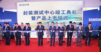 三星(中國)半導體有限公司在西安隆重舉行封裝測試生產線竣工投運儀式,與會嘉賓剪彩。 |