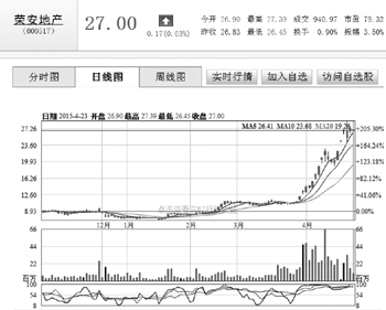 與公司業績大幅下滑相對應的卻是公司股價的大幅上漲。從3月27日到4月23日,短短18個交易日,榮安地產在利潤下滑97%的背景下,其股價竟從10.75元的開盤價一路上行,直到27元的收盤價,其漲幅高達151.16%,尤其是在4月8日,榮安地產發布2015年一季報業績下滑97%以上的當天,股價竟然漲停,4月9日公司股價再次漲停。