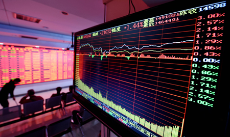 4月27日,上證綜指開盤重返4400點,此后穩步上行,尾盤觸及4529.73點的七年新高后,以4527.40點報收,較前一交易日大漲3.04%。深證成指走勢明顯弱于滬指,收盤報14809.42點,漲210.73點,漲幅為1.44%。 圖為當日股民在河南省洛陽市一家證券營業廳關注股市行情。