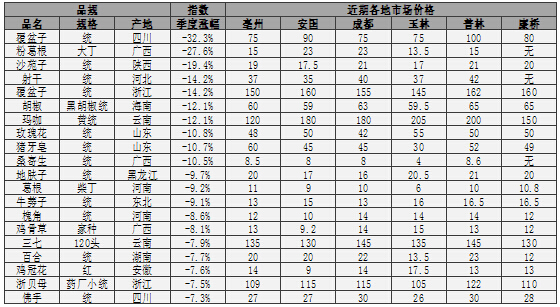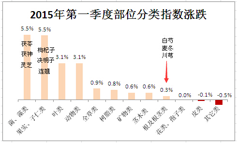 第一季度指數總體呈現上升趨勢,其中12大部位分類指數中,上漲部位9個走跌部位3個,并且上漲幅度明顯高于走跌幅度。本季度漲幅最高的是菌藻類和果實子仁類上漲5.5%,其中菌藻類主要由于茯苓、茯神和靈芝上漲所致,果實子仁類類主要由于枸杞子、決明子和連翹拉動效果,另外部位分類中第一大類根及根莖類微漲0.3%,其中上漲較明顯的有白芍、麥冬和川芎。其它部位分類指數漲跌情況如圖3所示。