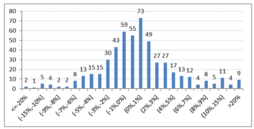 從漲跌各區間分布來看,513個代表品中,有73個品種漲跌幅度在區間0和1%之間,占比為14.2%,另外漲幅超過20%的品種有9個,跌幅超過20%的品種有2個。整體來看漲跌幅度與品種個數之間基本呈現正態分布,上漲品種稍多于走跌品種,且上漲幅度高于走跌幅度。具體各區間漲跌品種數如圖5所示。