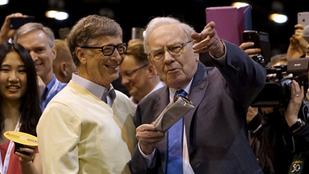 5月2日,美國伯克希爾-哈撒韋公司召開2015年度股東大會,對中國A股,公司董事長兼首席執行官、素有“股神”之稱的沃倫·巴菲特認為,中國的投資環境相對年輕,這導致市場更多地受到投機影響,中國市場可更注重價值投資。他說:“投資原則不應在國境線上止步。”圖為在美國奧馬哈,伯克希爾-哈撒韋公司股東大會召開之前,巴菲特(前右)與微軟公司創始人兼伯克希爾-哈撒韋董事比爾·蓋茨會面。