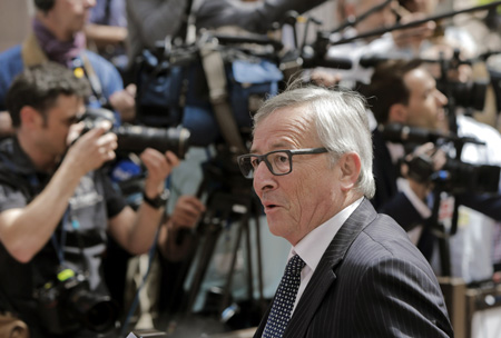 5月11日,歐盟委員會主席容克抵達(dá)比利時(shí)首都布魯塞爾的歐盟總部,出席歐元區(qū)財(cái)長會議。 當(dāng)日,歐元區(qū)財(cái)長再度聚首布魯塞爾,商討希臘債務(wù)問題。