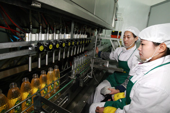 黑龍江青岡縣用活當地玉米資源,引進年產值超30億元的龍鳳玉米開發有限公司,解決了當地玉米銷售之困,為農戶提供再就業機會。圖為該公司生產線正在生產玉米胚芽油。(資料照片) |