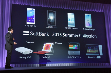 19日,在日本東京,日本軟銀移動公司總裁兼首席執(zhí)行官宮內(nèi)謙在新聞發(fā)布會上介紹產(chǎn)品。 當(dāng)日,為迎接2015夏季銷售,軟銀公司發(fā)布了新產(chǎn)品和服務(wù)項(xiàng)目。