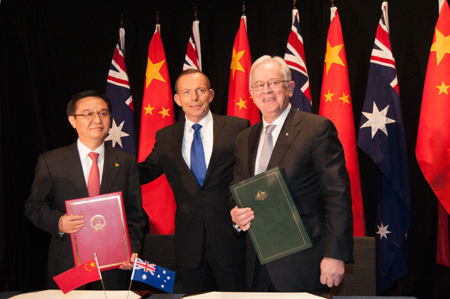 6月17日,在澳大利亞首都堪培拉國家美術館,中國商務部部長高虎城(左)和澳大利亞貿易與投資部部長安德魯·羅布(右)在分別代表兩國政府正式簽署《中華人民共和國政府和澳大利亞政府自由貿易協定》后與澳大利亞總理托尼·阿博特合影。根據協定,在貨物貿易領域,雙方各有占出口貿易額85.4%的產品將在協定生效時立即實現零關稅。