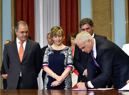 葡萄牙政府24日在首都里斯本與大西洋門戶聯(lián)合公司正式簽署葡萄牙航空股份轉(zhuǎn)讓協(xié)議,葡航空終于完成私有化改革。圖為當(dāng)日美籍巴西企業(yè)家大衛(wèi)·尼爾曼(右)與葡萄牙財(cái)長阿爾布克爾克(中)和經(jīng)濟(jì)部長利馬出席簽字儀式。