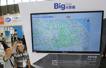 7月15日,上海觀眾在世界移動(dòng)大會(huì)上參觀實(shí)時(shí)交通顯示系統(tǒng)。??記者 裴鑫/攝 |