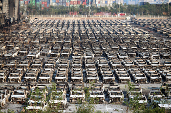 8月13日,在天津海濱爆炸現場,數千輛車輛被燒毀,損失巨大。 新華社記者 才揚/攝 |