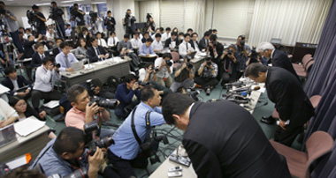 4月26日,在日本東京,日本三菱汽車公司社長相川哲郎(右中)出席記者會時鞠躬。三菱汽車上周承認,該公司有四款微型汽車在燃油經濟性測試中存在違規操作,以美化排放水平。 新華社/美聯? |