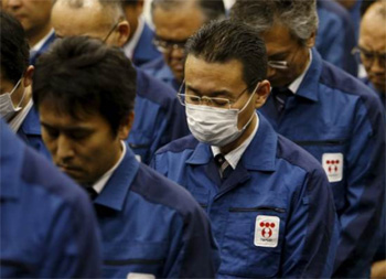 2016年3月11日,在日本東京,東京電力公司員工在下午2時46分默哀。 新華社/路透? |