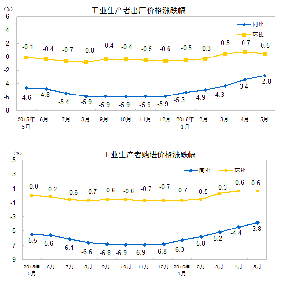 2016年5月份,全國工業生產者出廠價格環比上漲0.5%,同比下降2.8%。工業生產者購進價格環比上漲0.6%,同比下降3.8%。1-5月平均,工業生產者出廠價格同比下降4.1%,工業生產者購進價格同比下降5.1%。