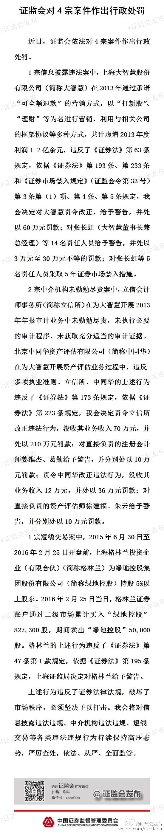 其中,1宗信息披露案為上海大智慧披露違法案,證監會決定對大智慧責令整改、處以警告,并處60萬元罰款,對14名相關責任人給予警告并處3萬到30萬元不等的罰款。