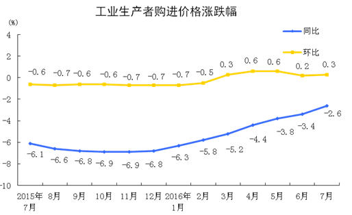 2016年7月份,全國工業生產者出廠價格環比上漲0.2%,同比下降1.7%。工業生產者購進價格環比上漲0.3%,同比下降2.6%。1-7月平均,工業生產者出廠價格同比下降3.6%,工業生產者購進價格同比下降4.5%。