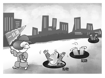 ??? 清晨6點(diǎn)出發(fā),晚上8點(diǎn)半解散,十幾個小時的“一日游”行程里,真正游覽時間只有不到一個小時,大部分時間則被導(dǎo)游安排在購物店和自費(fèi)景點(diǎn)……