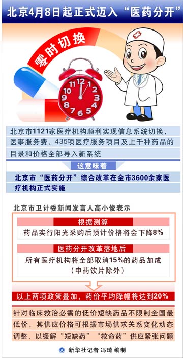 4月8日起,北京市實施了以取消藥品加成、設立醫事服務費、調整醫療服務價格等為主要內容的醫改措施。