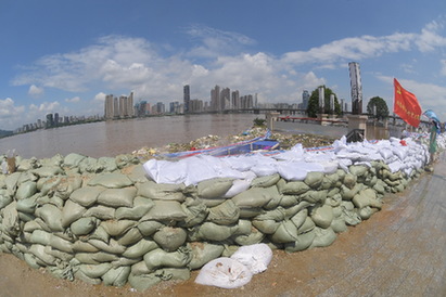 7月3日零時12分,湘江長沙站水位上升到39.51米,創(chuàng)下有記錄以來歷史新高。這是長沙城區(qū)湘江沿岸用沙袋修筑的子堤(7月3日攝)。記者 龍弘濤 攝? |
