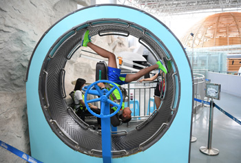 ??? 隨著暑假來臨,重慶科技館內(nèi)的科普演示裝置和互動(dòng)項(xiàng)目吸引眾多孩子參觀體驗(yàn),孩子們?cè)谳p松愉快的氛圍中學(xué)習(xí)科學(xué)知識(shí)、體驗(yàn)科學(xué)魅力。記者 王全超 攝 |