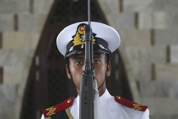 8月14日,在巴基斯坦卡拉奇,一名海軍士兵在國父穆罕默德·阿里·真納的陵墓前警戒。當日,巴基斯坦舉行系列活動,紀念獨立70周年。新華社/美聯? |