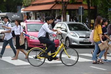 ?8月15日,在泰國曼谷的泰國國立法政大學,一名學生使用ofo小黃車出行。中國共享單車品牌ofo小黃車近日進駐泰國市場,首批6000輛ofo小黃車將逐步投放至泰國多所高校。記者 李芒茫 攝 |