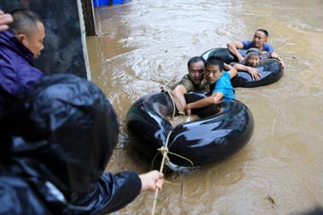 8月13日,在廣西柳州市融水苗族自治縣桿洞鄉,救援人員轉移被洪水圍困的居民。連日來,受廣西融水苗族自治縣境內以及上游持續強降雨影響,融江水位猛漲,融水縣城低洼地段被洪水淹沒,部分鄉鎮遭遇山洪。新華社發(龍濤 攝)? |