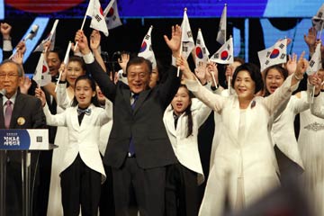 8月15日,在韓國首爾,韓國總統文在寅(前中)出席光復節72周年紀念活動。文在寅15日呼吁和平應對朝鮮半島核問題,表示韓方將竭盡全力阻止朝鮮半島發生戰事。記者 姚琪琳 攝? |