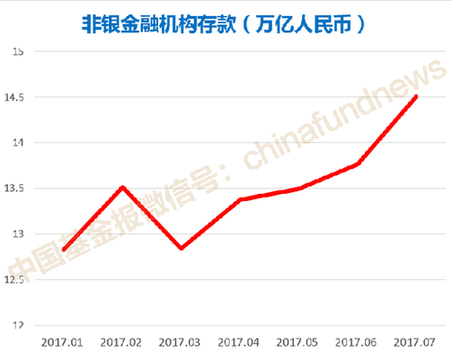 2017年1月,非銀金融機構存款規模為12.83萬億元,6月增長到13.76萬億元。最新公布的7月數據顯示,非銀金融機構存款規模達14.5萬億元,環比1月大幅增加1.67萬億元,增幅達13%。