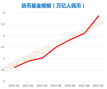 中國基金報記者計算數據顯示,2017年7月貨幣基金總規模已經比1月飆升了2.25萬億元,環比增長幅度超過60%。