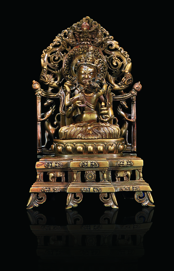 “玉器工藝品”專場中,以玉器開場,甄選牌、佩、山子、爐、屏等不同玉質(zhì),各式器型的拍品,以供選藏。其中“清乾隆白玉留皮朝冠耳獸足爐”尤為突出,玉質(zhì)瑩潤,玉色潔白,選料較大,掏膛爽利,加之獸足寥寥數(shù)刀,生動(dòng)逼真,頗為添色。佛教藝術(shù)品一類亦是本專場的重點(diǎn),其中不同時(shí)期的金銅造像,即有宮廷風(fēng)格,又有西藏風(fēng)格等。其中“清乾隆銅鎏金財(cái)寶天王像”為乾隆宮廷造像,鑄造生動(dòng),鏨刻清晰,實(shí)為藏奉首選。另外,“清乾隆合金銅白上樂金剛像”亦十分突出,反映了乾隆宮廷在佛造像中的慕古風(fēng)格,表現(xiàn)出清廷對于西藏所供古代風(fēng)格造像的推崇,作品遵循經(jīng)典的印度樣式,寶座及背光均頗具特色。