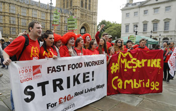 ??? 9月4日,英國部分麥當勞員工舉行罷工,以期提升薪資水平、改善工作條件。這是麥當勞在英國開業以來首次發生罷工事件。新華社/法新 |