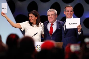 ??? 9月13日,國際奧委會主席巴赫(中)在宣布2024和2028年奧運會主辦城市后與巴黎市長伊達爾戈(左)和洛杉磯市長加切蒂慶祝。當日,國際奧委會在秘魯首都利馬舉行的第131次全會上最終確定巴黎為2024年夏季奧運會主辦地、洛杉磯為2028年夏季奧運會主辦地。新華社發(路易斯·卡馬喬 攝) |