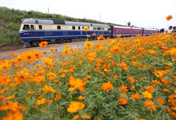 ??? 9月9日,河北秦皇島“秦旅山海號”旅游列車行駛在秦皇島市海港區杜莊鎮境內的徐莊站附近。 當日,“秦旅山海號”旅游列車在改造修建完工的山海旅游觀光鐵路上進行運行測試。列車最高時速為60km/h,共5節客車車廂,可同時容納436名乘客乘坐。據介紹,這條鐵路起自秦皇島港西港碼頭,終點為板廠峪景區,全長41.2公里,途經代表著秦皇島歷史文化、工業發展、地質特色的景區,連山接海,沿途風景美不勝收。記者 楊世堯 攝 |