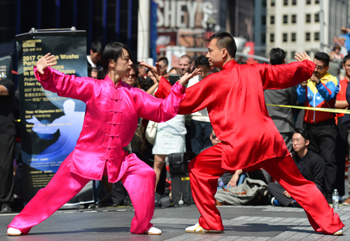 ??? 9月10日,在美國紐約時報廣場,武術運動員陳思坦(右)和林旭表演“太極對練”。當日,由中國國家體育總局與國際武術聯合會發起、以“和諧、健康、共享”為主題的武術表演活動在時報廣場舉行。數十位中國優秀武術運動員和美國本土武術愛好者共同在這里為觀眾獻上太極拳、太極扇、太極對練、集體拳等表演,展示了中國武術文化的風采。記者 李睿 攝 |