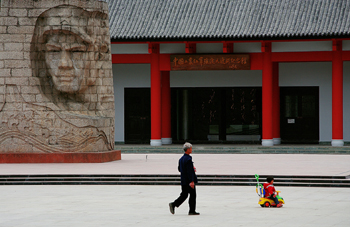 ??? 圖為紅軍強(qiáng)渡大渡河紀(jì)念館外,一名老人帶著孩子在經(jīng)過。(四川省旅游發(fā)展委員會供圖) |