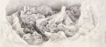 此次這件《山原的凝視》,正是受讓·奧古斯特·多米尼克·安格爾的名作《露易斯·奧松維爾夫人》的啟發,畫中夫人的眼神引起了劉丹的注意與無限的遐想,她瞳孔中的深邃透閃著神秘的光芒,充滿了無法捉摸的可能,正是在這迷人的眼神之中,劉丹的心中閃現出了一脈奇幻的山原。藝術家將古今中西的經緯彌合在了一仁瞳孔之中,他讓我們在奧松維爾夫人的凝視中看見了另一個維度中的山原川澤。