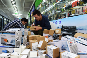 ??? “雙11”臨近,浙江義烏國際商貿城的工作人員忙著接單、打包,為即將到來的網購熱潮積極備戰。圖為11月8日,商家工作人員為包裹貼上快遞單。新華社發(龔獻明 攝) |