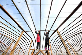 ??? 11月7日,山東省沂源縣東沙溝村的農民在搭建蔬菜大棚。當日是二十四節氣中的立冬,各地農民搶抓農時做好采收、播種、御寒管理等工作,田間地頭一派繁忙。新華社發(趙東山 攝) |