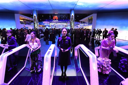 為期四天的2018年世界移動通信大會2月26日在巴塞羅那開幕。圖為當日,人們在西班牙巴塞羅那舉行的世界移動通信大會上參觀華為公司展臺。新華社記者 郭求達 攝