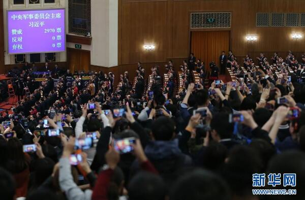 3月17日,十三屆全國人大一次會議在北京人民大會堂舉行第五次全體會議。習近平全票當選為國家主席、中央軍委主席。 新華社記者 金立旺 攝
