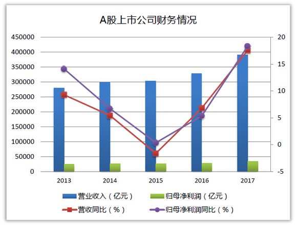 4月末,A股上市公司2017年年報披露結束。Wind統計數據顯示,2017年,A股上市公司的營收、凈利潤同比都有較大幅度上升。截至2017年12月,A股上市公司共3467家,實現營業收入38.96萬億元,同比增加17.2%,歸母凈利潤3.35萬億元,同比增18.3%,歸母凈利潤增速高于營業收入增速。滬深兩市公司在經濟發展的韌性、結構優化、新動能等方面呈現出多個新亮點,高質量發展的趨勢正在形成。
