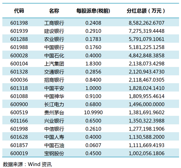 從分紅的總金額來看,計劃分紅超百億的公司共有17家,均出自上交所,且均為“百億俱樂部”的成員,其中,工商銀行以 858.23億元排在第一位;而從每股派息金額來看,貴州茅臺以10.9990元高居第一位,不過當前茅臺的股價也是遠遠高于其它個股。