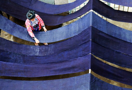 上圖:在廣西融水苗族自治縣紅水鄉(xiāng)黃奈苗寨,苗族婦女在晾曬染過的棉布。右下圖:苗族婦女在一塊織好的花飾上剪線頭。