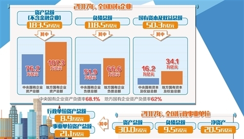綜合報告切實摸清國有資產“家底”,向全國人大和全國人民報告全口徑國有資產的“明白賬”。綜合報告顯示,在企業國有資產(不含金融企業)方面,2017年,中央國有企業資產總額76.2萬億元,負債總額51.9萬億元,國有資本及權益總額16.2萬億元,資產負債率68.1%。2017年,地方國有企業資產總額107.3萬億元,負債總額66.6萬億元,國有資本及權益總額34.1萬億元,資產負債率62%。