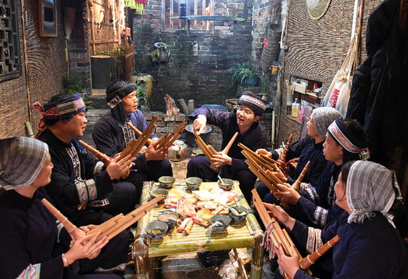 圖為徐維生(中)和幾個村民一起探討蘆笙吹奏技藝。