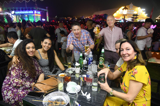 外國游客在青島西海岸新區(qū)金沙灘啤酒城一啤酒吧體驗(yàn)、消費(fèi)。記者 李紫恒 攝