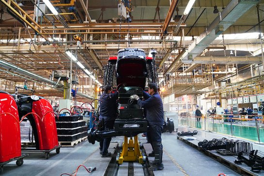 圖為工人在一拖集團(tuán)工廠的生產(chǎn)流水線(xiàn)上工作。記者 盧燁 攝